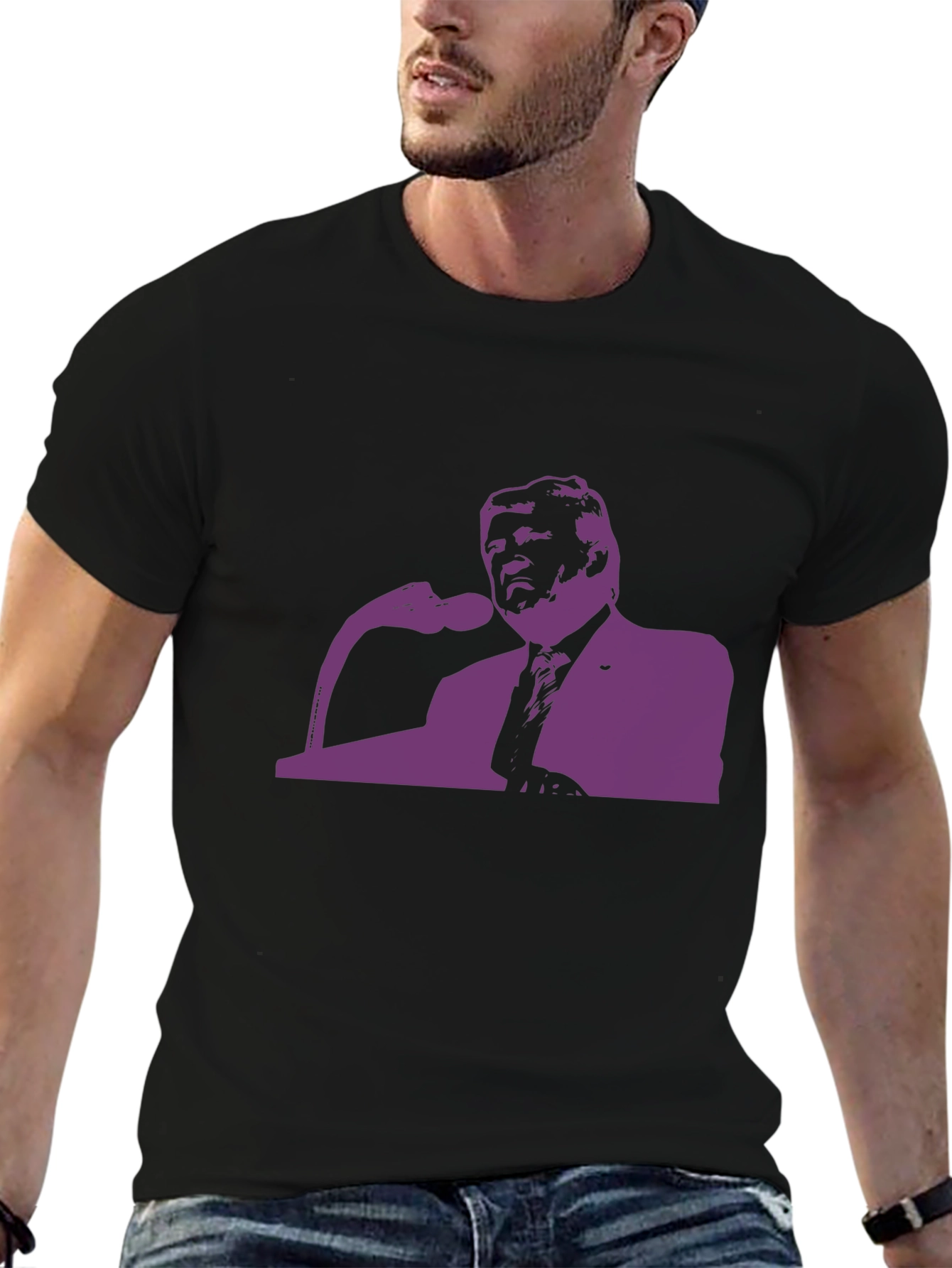 Make a statement with this eye-catching graphic t-shirt. The bold design features a purple silhouette of a political figure speaking at a microphone against a black background. Made from comfortable materials, this tee is perfect for expressing your views. Its classic fit makes it ideal for casual wear, political rallies, or sparking conversations. Show your support and stand out from the crowd with this unique t-shirt. This tee is a great way to express your support.