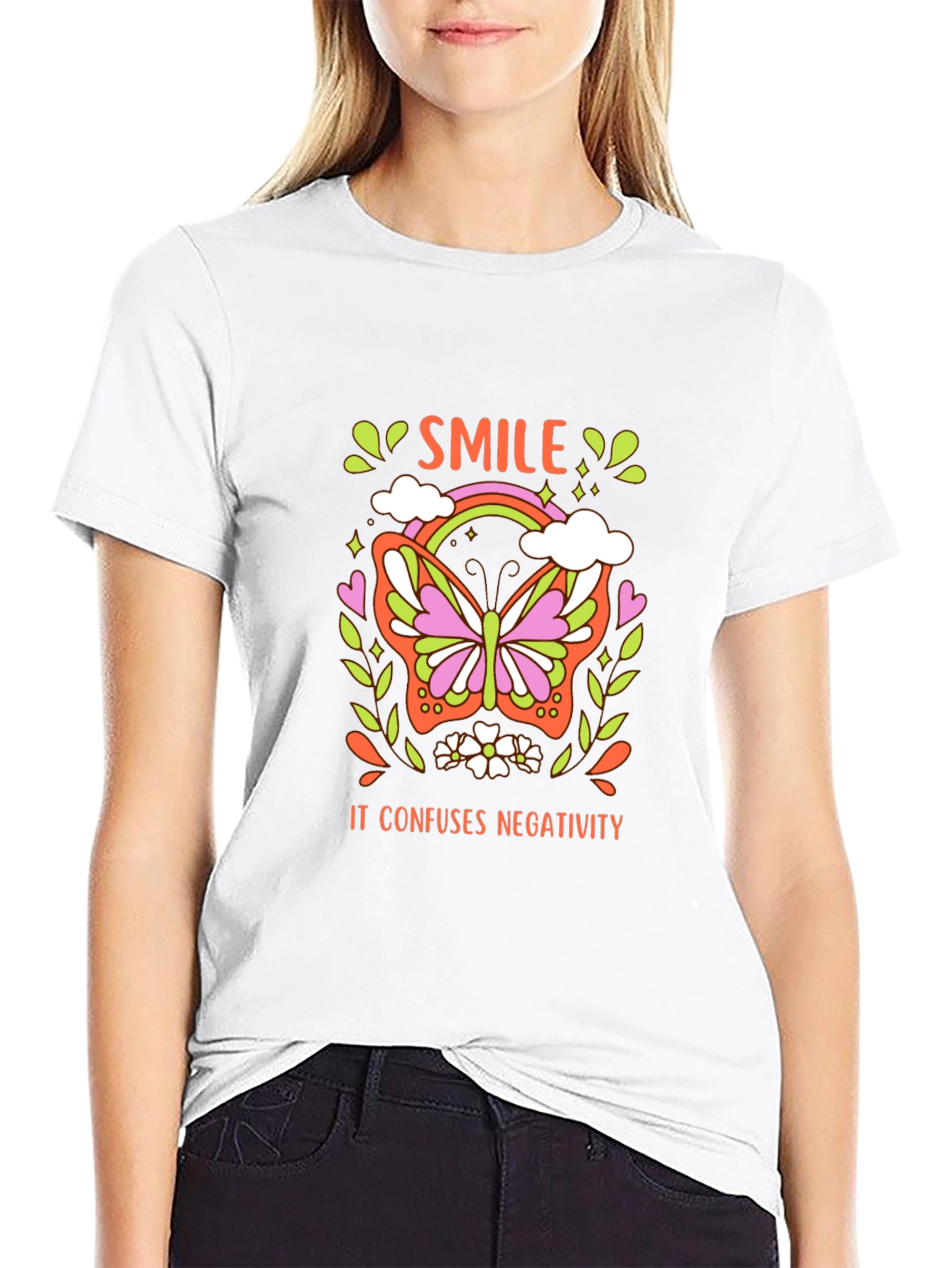 Spread positivity with this unique graphic tee! The black t-shirt features a vibrant butterfly design surrounded by cheerful motifs. Above, the word "SMILE" is playfully adorned with bright green accents. Below, the phrase "IT CONFUSES NEGATIVITY" reinforces the tee's uplifting message. Perfect for casual wear, this comfortable tee will add a touch of whimsy to your everyday style. Wear it to brighten your day, or gift it to someone who needs a little extra sunshine! This tee is sure to be a conversation starter, spreading smiles wherever you go.